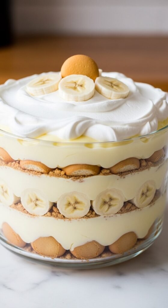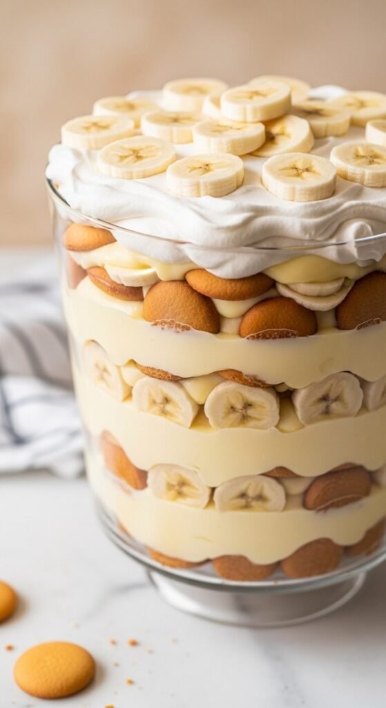 A full trifle bowl layered with vanilla wafers, banana slices, pudding, and whipped cream is the most visually impressive banana dessert you can bring to a gathering — and it requires zero cooking.