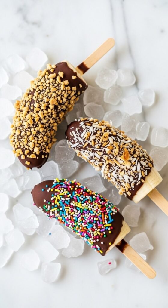 Whole bananas on a stick dipped in dark chocolate and coated in toppings are the most dramatic frozen banana dessert — each one looks like a carnival treat and costs under 50 cents to make.