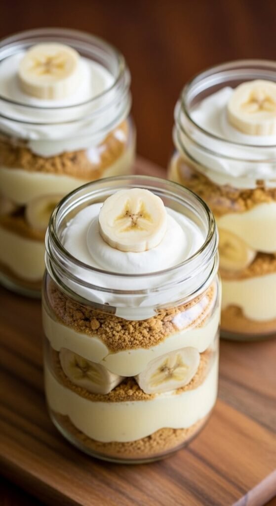 Banana pudding layered in sealed mason jars makes a dessert you can gift, meal prep, or take to a party without a serving spoon — and the layers look visually impressive through the glass.