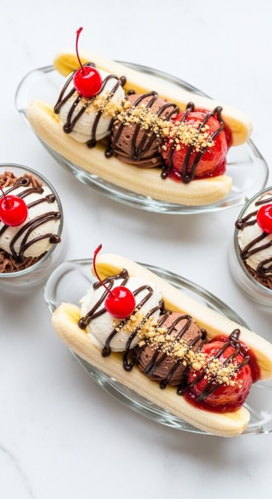 Deconstructed banana split served in individual cups with vanilla cream, chocolate sauce, strawberry jam, and a cherry on top delivers the full classic experience in a party-ready no-bake format.