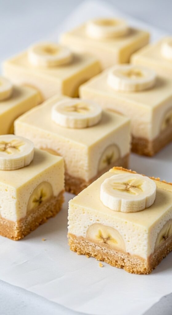 A vanilla wafer crust pressed under a banana cream cheese filling that includes instant pudding mix for extra structure creates a dessert bar that slices cleanly and holds its shape on a platter.