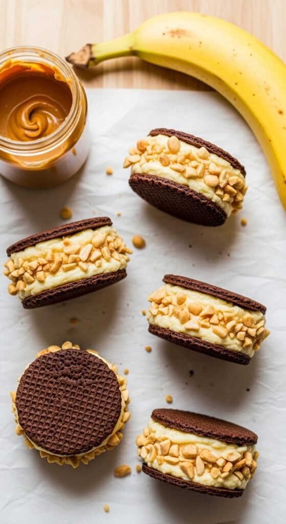 Frozen banana nice cream with peanut butter folded in, sandwiched between two thin chocolate wafers, creates a dairy-free frozen sandwich that uses up overripe bananas and tastes like dessert worth planning for.