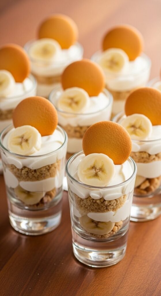 Banana pudding portioned into shot glasses creates the most share-friendly version of the classic — each guest gets their own self-contained serving, and the layers look beautiful through the glass.