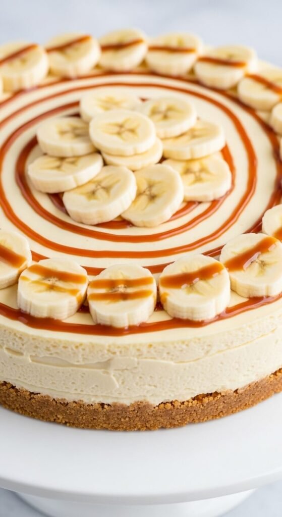 Press a graham cracker crust into a springform pan and fill with the banana cream mixture. Refrigerate at least four hours — overnight produces the cleanest slices. Arrange banana slices across the top with a caramel drizzle before serving. Serves 10 to 12 for about $10.