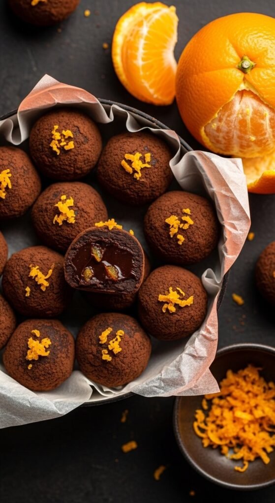 Orange and dark chocolate is a combination with a deep and well-earned reputation — the sharp citrus brightens the bitter chocolate and makes both flavors more distinct and more memorable. Stir the finely grated zest of one large orange into the warm ganache while it is still liquid so the zest oils are fully incorporated throughout the entire batch. A tablespoon of fresh orange juice adds additional citrus depth without thinning the ganache excessively. Roll in cocoa powder and press one small piece of candied orange peel on top as a finishing garnish. One orange costs $0.50 to $1 and provides enough zest for a full batch. Total batch cost: about $5.
