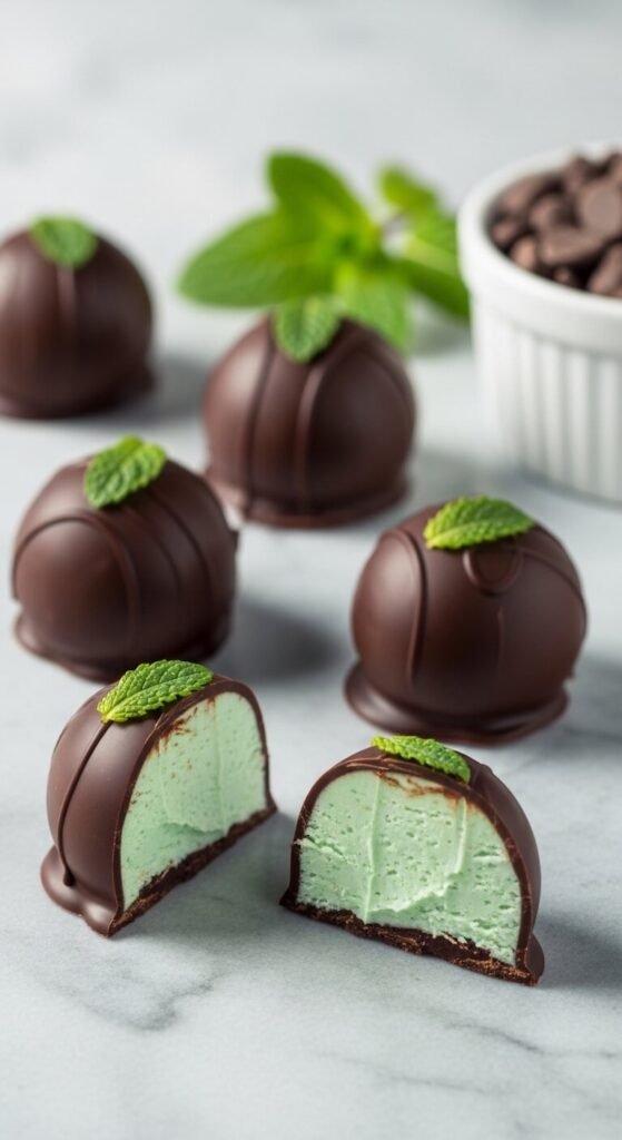 Mint chocolate truffles have a cool, clean finish after the rich dark chocolate — the contrast between the slightly bitter chocolate shell and the cooling peppermint center is genuinely refreshing in a way no other truffle flavor achieves. Add three drops of peppermint extract to a dark chocolate ganache — taste before adding more, as peppermint extract is concentrated and two drops too many creates a toothpaste flavor rather than a dessert one. For a more natural approach, steep fresh mint leaves in the warm cream before adding the chocolate. Roll in cocoa or dip in dark chocolate. A batch of 20 mint chocolate truffles costs about $5. Press a small fresh mint leaf into the top shell before it sets.