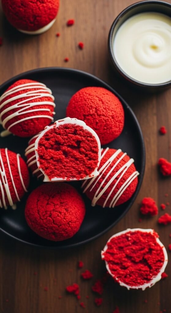 Red velvet cake truffles use crumbled cake as the truffle base — a technique that produces a firmer, crumblier interior texture than ganache truffles and a vivid red exterior that looks absolutely striking in a gift box. Crumble a store-bought red velvet cake or bake a simple red velvet mix, then mix with cream cheese until the mixture forms a firm dough. Roll into balls, refrigerate for one hour, then dip in melted white chocolate. The vivid red truffle interior shows through when the white chocolate coating is thin. A store-bought red velvet cake costs $4 to $6. A batch of 24 cake truffles costs about $7 total. Always an attention-getter in a mixed truffle box.