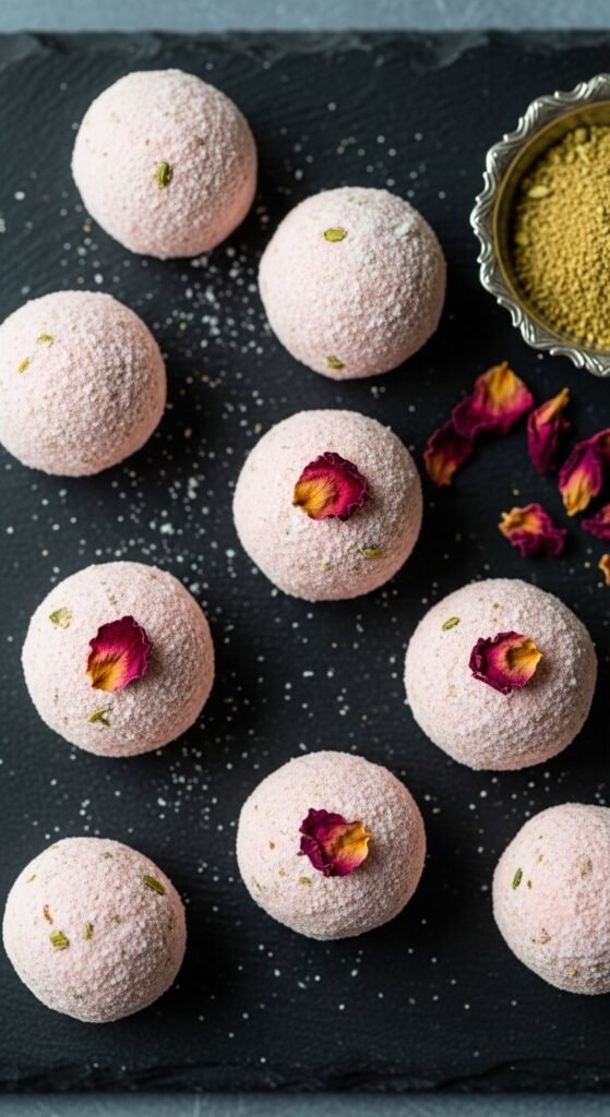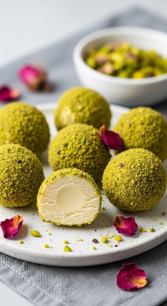 Pistachio and rose truffles are the most visually exotic on this list — the vivid green of the crushed pistachio coating against the pale white chocolate base and the scattered dried rose petal garnish creates a box of truffles that looks like it came from a high-end Middle Eastern confectionery. Make a white chocolate ganache with a few drops of rose extract — use sparingly, as rose extract is intensely floral and a little goes a long way. Roll into balls and coat in finely crushed roasted pistachios. A bag of shelled pistachios costs $5 to $7. A small bottle of rose extract costs $3 and lasts for many batches. A batch of 16 truffles costs about $9.