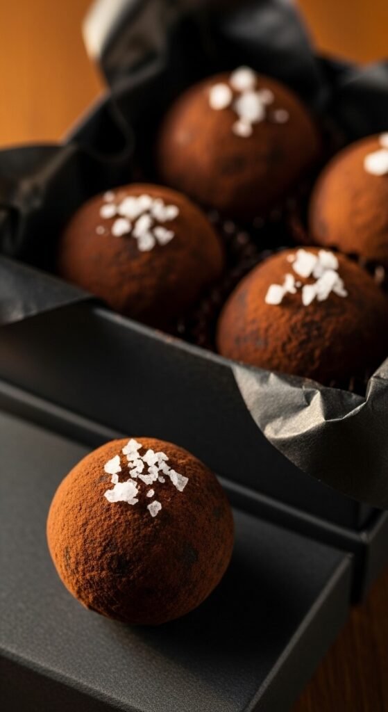 Salted dark chocolate truffles are the adult minimalist truffle — just excellent dark chocolate, cream, and the right amount of flaky sea salt applied with enough restraint to taste intentional rather than accidental. Make a standard 70% dark chocolate ganache with a pinch of fine salt stirred in during mixing, then roll in cocoa powder and press two or three large flakes of Maldon sea salt on top of each truffle just before serving or gifting. The coarse salt on top provides the flavor hit immediately at first bite — the salt inside the ganache provides the sustaining background depth. A batch of 20 costs about $6. Pack in a black box for the most sophisticated gift presentation.
