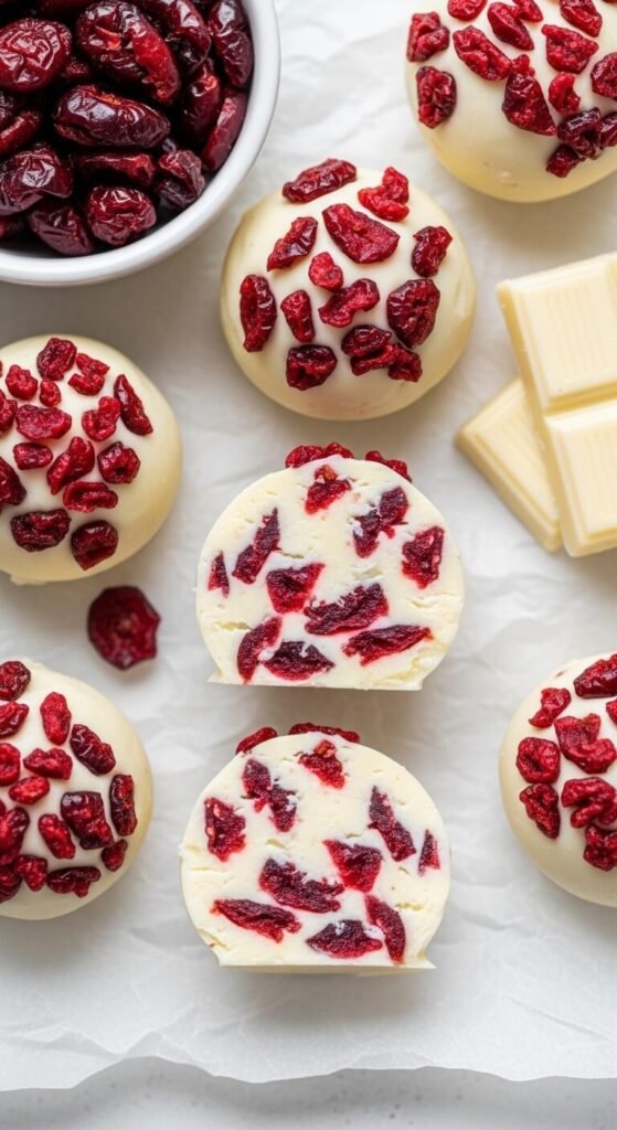 Cranberry white chocolate truffles are the most seasonal and most visually festive of all truffle options — the vivid red cranberry pieces visible throughout the pale white chocolate base make them look like jeweled ornaments, and they are the first truffle to disappear from any Christmas gifting box. Fold chopped dried cranberries into a warm white chocolate ganache before chilling — the cranberries distribute throughout the mixture and are visible in every cross-section. Roll into balls and coat in additional white chocolate drizzle or white sprinkles. Dried cranberries cost $3 to $4 for a bag that makes multiple batches. A batch of 18 cranberry white chocolate truffles costs about $7 total.