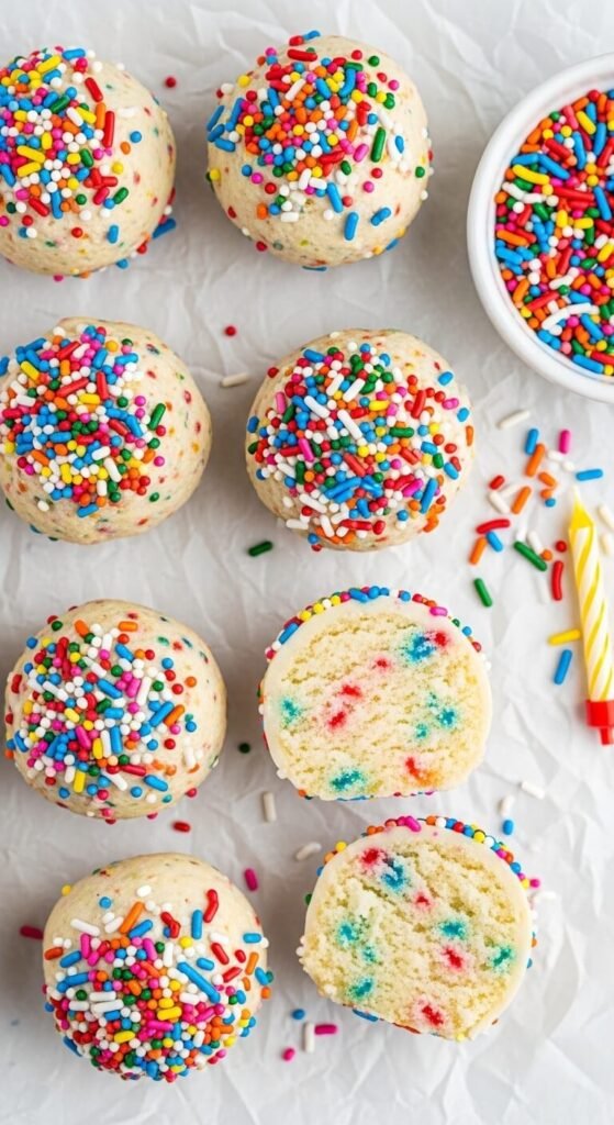 Birthday cake truffles are cake truffles dressed up for celebration — the rainbow sprinkles folded through the cake crumb and cream cheese base turn every bite into something genuinely festive. Crumble a vanilla or funfetti cake and mix with cream cheese and vanilla extract until the mixture forms a firm dough. Fold in a generous amount of rainbow sprinkles — the more sprinkles, the more colorful the interior cross-section. Roll into balls and dip in melted white chocolate. Press additional sprinkles into the wet white chocolate coating immediately before it sets. A box of funfetti cake mix costs $2 to $3. A batch of 24 truffles costs about $6 total. The most fun truffle to give and receive.