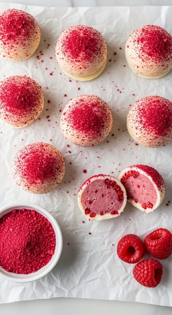 White chocolate and raspberry is one of the most crowd-pleasing truffle flavor combinations — the sweetness of white chocolate and the tartness of raspberry create a balance that makes these hard to stop eating. Make a white chocolate ganache by pouring warm cream over white chocolate chips, then stir in freeze-dried raspberry powder until fully incorporated. Refrigerate until firm, roll into balls, and coat in additional raspberry powder for a vivid pink exterior. Freeze-dried raspberry powder costs $4 to $6 for a small bag and makes several batches. A batch of 18 truffles costs about $7 total. These look especially beautiful gifted in a white box against white tissue paper.