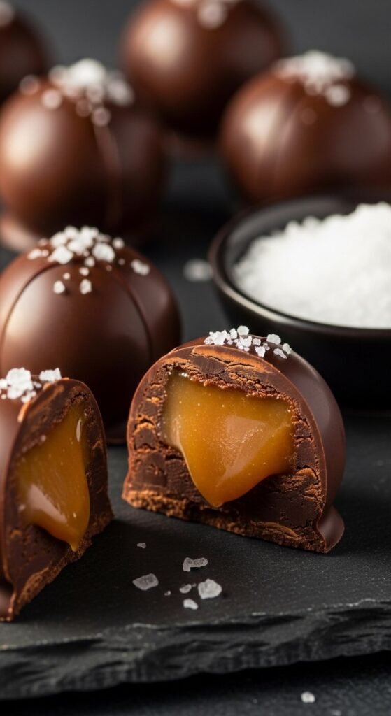 Sea salt caramel truffles are the most universally loved flavor combination in the truffle category — the bitter dark chocolate, the sweet caramel center, and the sharp salt hit are the reason people eat a second one before the first has been fully appreciated. Make a ganache from dark chocolate and cream and chill until barely firm. Flatten a small disc of the ganache, place a small piece of soft caramel or a spoonful of dulce de leche in the center, and wrap the ganache around it. Roll into a ball, refrigerate until firm, then dip in melted dark chocolate. Press two flakes of sea salt on top before the shell sets. A batch of 16 costs about $8.