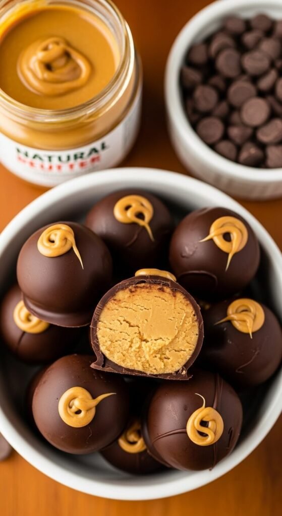 Peanut butter and chocolate truffles taste like a homemade Reese’s peanut butter cup — the rich, salty peanut butter center against the dark chocolate shell is the combination that guarantees an empty tray. Mix natural peanut butter with powdered sugar and a pinch of salt until the mixture holds its shape when rolled. Chill the filling for 30 minutes, roll into balls, and dip in melted dark chocolate. Refrigerate until the shell sets. Natural peanut butter — just peanuts and salt — gives the cleanest, most genuine peanut flavor. A batch of 20 truffles costs about $5 total. These are the least expensive and most requested truffle on this list.