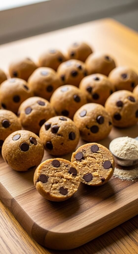The foundational post-workout protein ball — rolled oats, peanut butter, vanilla whey protein, honey, and mini chocolate chips in a ratio that delivers approximately 7 to 8 grams of protein per ball. Use vanilla whey protein for the most neutral, complementary flavor — it mixes cleanly into peanut butter without producing the chalky aftertaste that casein and plant-based proteins sometimes create in cold applications. Keep protein powder to ¼ cup per batch maximum — more than that produces a dry, crumbly texture that peanut butter can’t rescue. Refrigerate 30 minutes before rolling. Budget tip: a standard whey protein tub handles about 15 batches at roughly $0.40 of protein powder per batch.