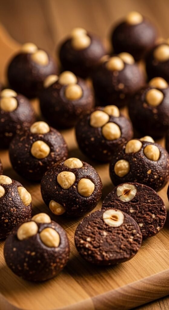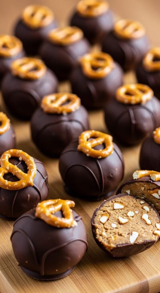 Chocolate protein powder, peanut butter, oats, honey, cocoa, and roughly crushed pretzels produce a salty-sweet-chocolatey protein ball that delivers approximately 8 grams of protein per serving and a satisfying crunch that plain protein balls can’t offer. The salt in the pretzels permeates the ball during refrigeration, creating a salted chocolate-peanut butter effect throughout every bite rather than just at the surface. Use pretzel pieces roughly crushed to pea-sized chunks — fine crumbs don’t add enough textural contrast. Fold in ½ cup of crushed pretzels per batch just before rolling. The pretzel pieces that protrude from the surface signal the crunch before the first bite.
