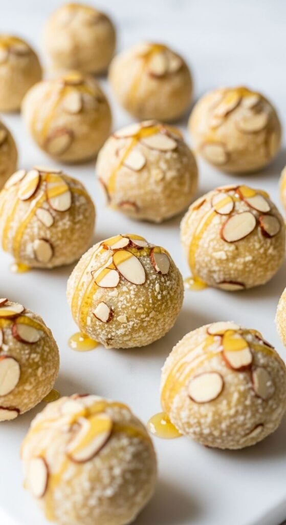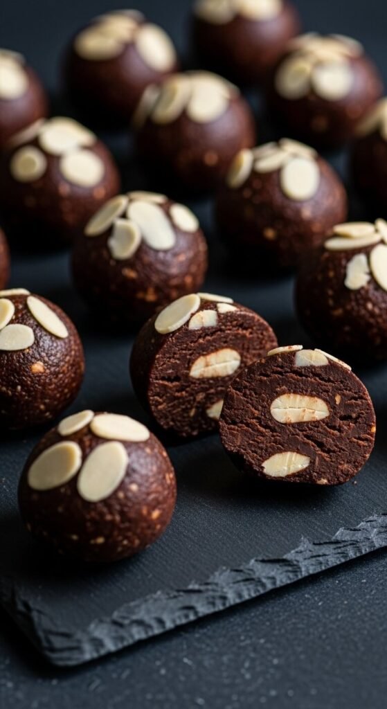 Dark cocoa, almond butter, chocolate protein powder, honey, and rolled oats produce a post-workout ball with approximately 8 grams of protein per serving and a genuinely satisfying dark chocolate flavor. Use chocolate whey or plant-based chocolate protein for a double-chocolate effect — the cocoa powder and protein powder work together to produce a darker, more intense flavor than either alone. Add ¼ teaspoon of almond extract alongside the vanilla — it amplifies the almond flavor without requiring more almond butter. Press sliced almonds into each ball before refrigerating. Budget tip: store-brand cocoa powder costs about $3 per container and handles 20 batches of protein balls.