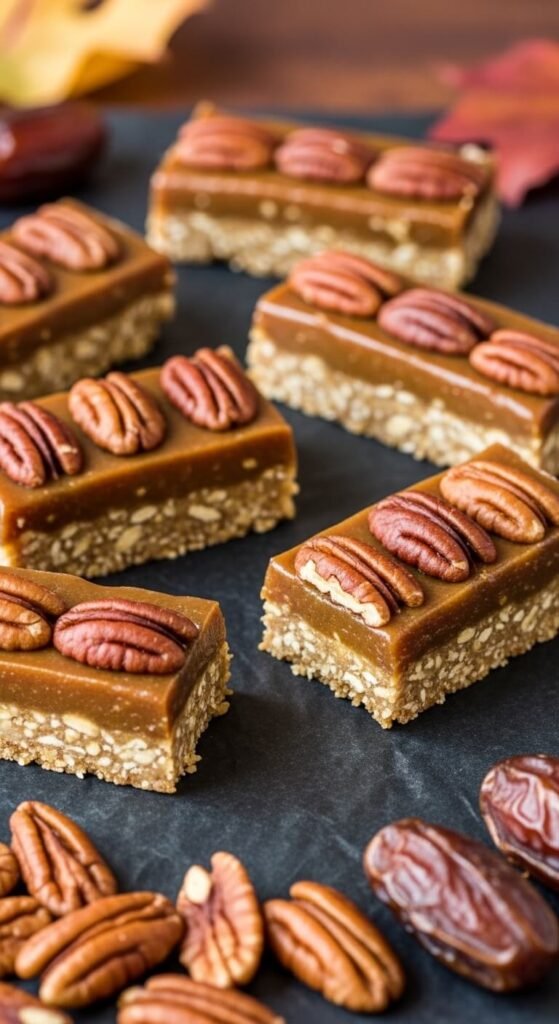 Filling: blend one and a half cups of pitted Medjool dates, one cup of pecans, two tablespoons of maple syrup, half a teaspoon of cinnamon, and a pinch of salt. Spread over base. Top with whole pecans. Freeze two hours. Slice into bars.