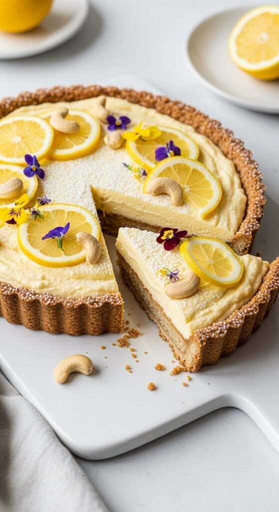 A lemon cashew cream filling in an almond-coconut crust creates a bright, citrusy tart that is both visually stunning and completely dairy-free.