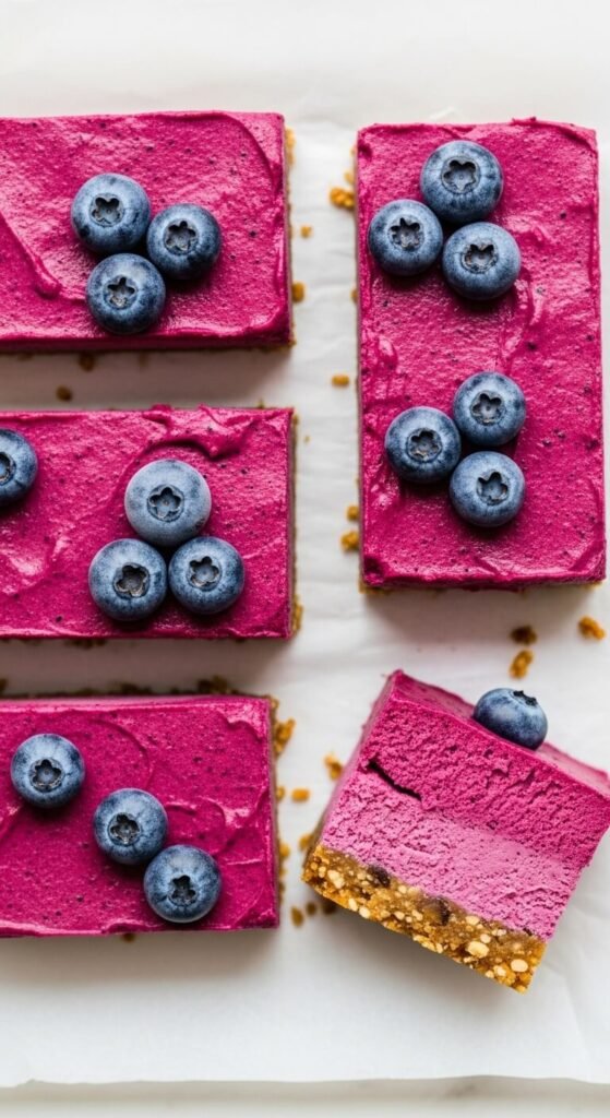 Acai powder blended into a cashew cream filling turns a standard dairy-free cheesecake bar into something visually dramatic and antioxidant-rich — with no artificial coloring of any kind.
