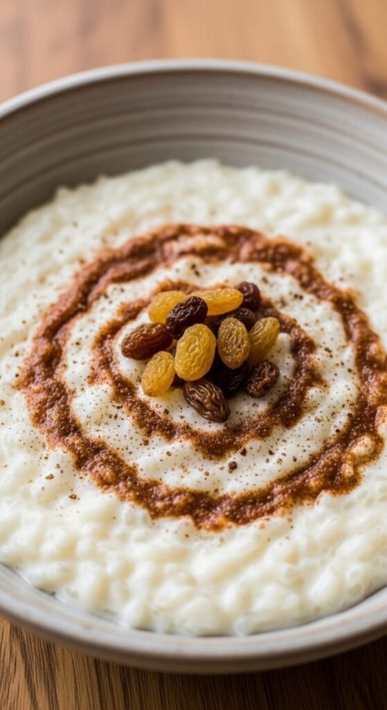 Cooked arborio rice cooled and finished with cold almond milk, maple syrup, and cinnamon produces a rice pudding that is creamy, comforting, and entirely dairy-free.