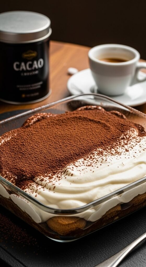 Dip dairy-free ladyfingers or thin almond flour sponge in strong espresso. Layer with coconut cream. Repeat. Top with a generous dusting of cacao powder. Refrigerate four hours minimum — overnight produces the best flavor as the layers fully meld together. Serves eight to ten people.
