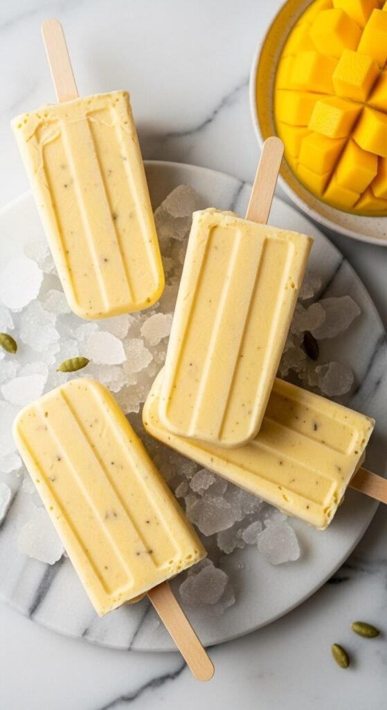 Coconut yogurt blended with ripe mango and a pinch of cardamom creates a dairy-free lassi popsicle that is creamy, lightly spiced, and deeply refreshing straight from the freezer.