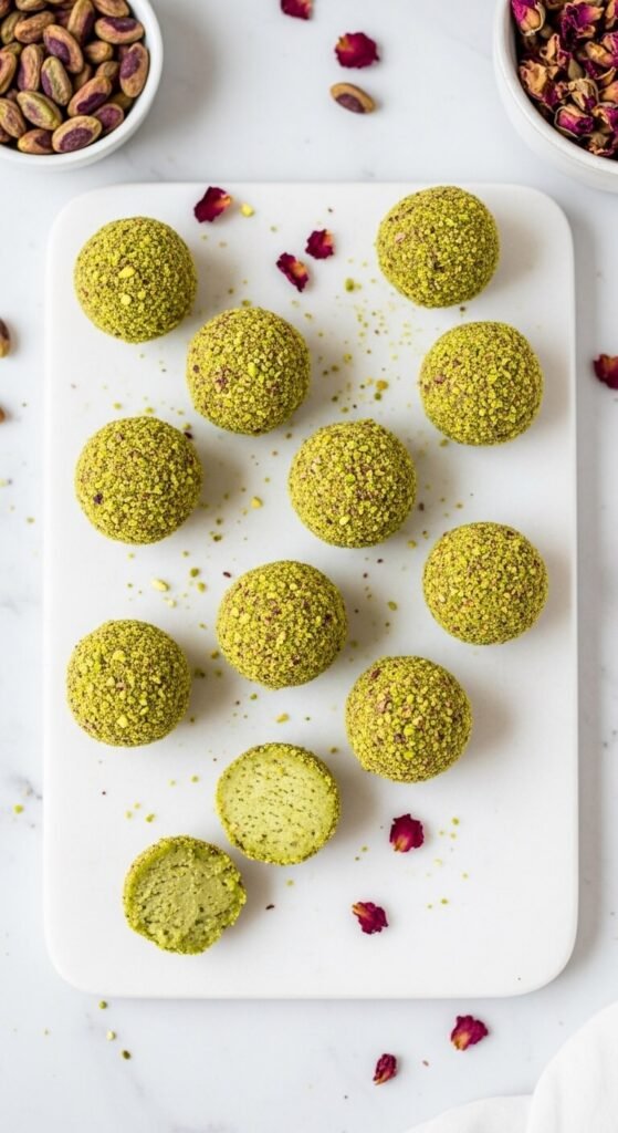 Ground pistachios and a few drops of rosewater create a bliss ball that is floral, slightly earthy, and completely unlike anything you’d find in a mainstream dessert aisle.