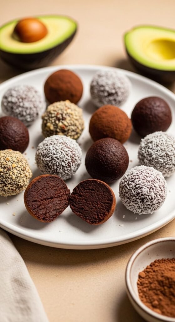 Ripe avocado blended with melted dark chocolate creates a truffle filling that is rich, smooth, and 100% dairy-free — the avocado provides the fat and creaminess without contributing any flavor.
