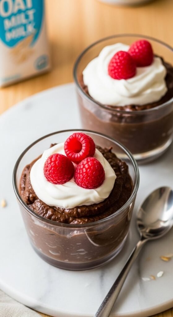 Oat milk thickened with cornstarch or arrowroot and flavored with cacao creates a chocolate pudding that is velvety, deeply flavored, and completely plant-based with no specialty ingredients required.