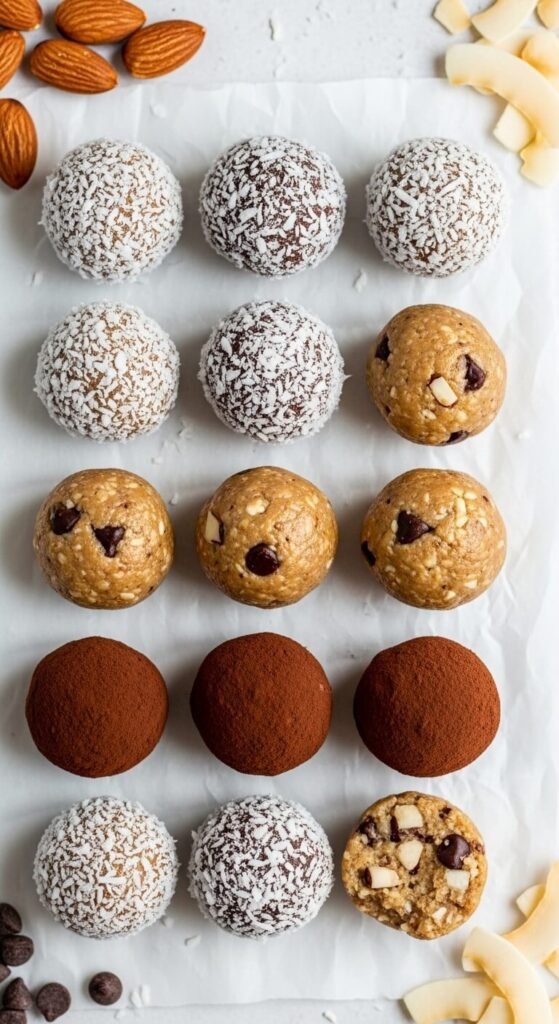 Almond butter, oats, and desiccated coconut held together with maple syrup create dairy-free energy balls that are chewy, subtly sweet, and satisfying as a two-bite dessert.