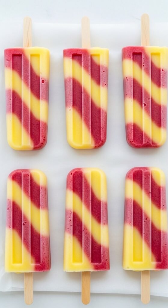 Swirl popsicles look like a professional product and are produced by the simplest technique — pouring two mixtures simultaneously or in alternating spoonfuls and dragging a skewer through them before freezing. Make a blended strawberry purée and a simple lemonade separately. Pour alternating spoonfuls of each into the mold and drag a wooden skewer in one circle through the two layers before inserting the stick. The swirl locks in place during freezing. The key is not over-mixing — two or three circles with the skewer creates a visible swirl; more turns the two colors into an orange blend. A batch of eight swirl popsicles costs about $4 total.