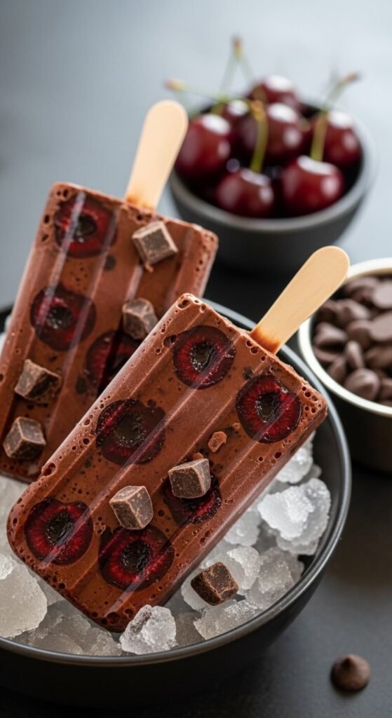 Cherry Garcia popsicles recreate the famous ice cream flavor in a simple frozen pop — dark chocolate, dark cherries, and a creamy base are all that is required. Blend full-fat coconut cream or Greek yogurt with pitted frozen dark cherries, a tablespoon of cocoa powder, and honey. Fold in dark chocolate chips and cherry pieces before pouring into molds. Frozen dark cherries cost $3 a bag and are available year-round in the freezer section. A batch of eight popsicles costs about $5 total. These are the popsicle for children who have already graduated from simple fruit versions and want something richer.
