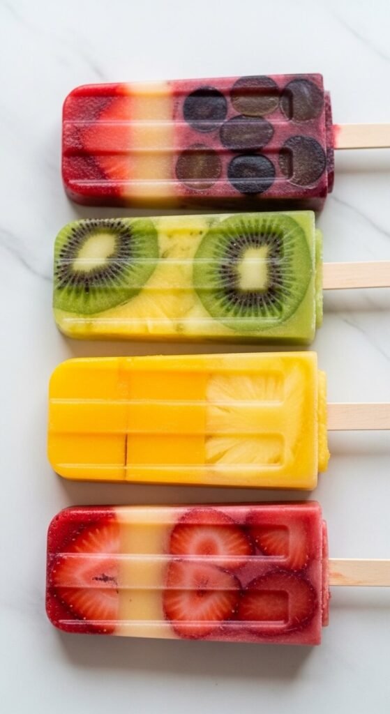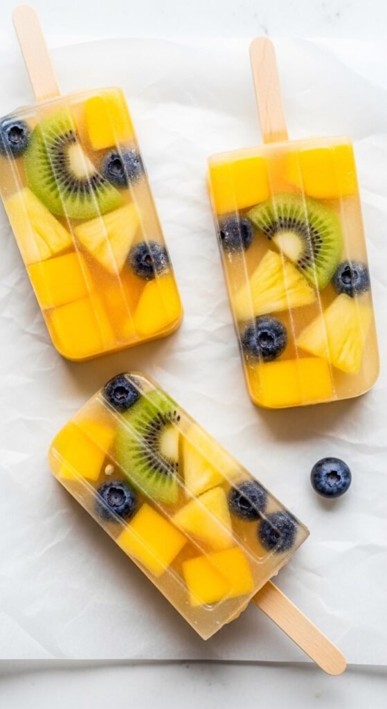 Tropical fruit salad popsicles are the most visually spectacular on this list — pieces of whole fruit suspended in a clear tropical juice create a popsicle that looks like a snow globe of summer fruit. Use store-bought tropical or mango juice as the base and fill each mold with a selection of small fruit pieces first — mango cubes, kiwi circles, pineapple chunks, blueberries. Pour the juice over the fruit slowly so the pieces stay distributed rather than floating to the top. The fruit freezes in place suspended in the clear juice. A carton of tropical juice costs $2 to $3. A packet of mixed frozen tropical fruit costs $3. A batch of eight popsicles costs about $5.
