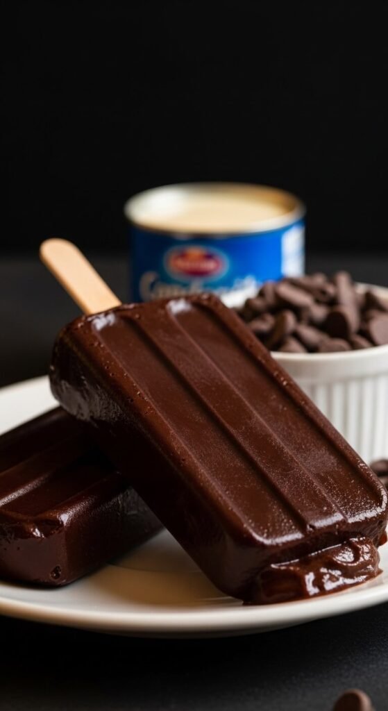 Chocolate fudge popsicles are the frozen version of a thick hot chocolate — dense, intensely chocolatey, and creamy in a way that a fruit popsicle simply cannot be. Whisk sweetened condensed milk with cocoa powder and whole milk until the cocoa is fully dissolved and the mixture is completely smooth. Pour into molds and freeze for at least six hours — the condensed milk base takes longer to freeze solid than a juice-based popsicle. These need a minimum of six hours; overnight is better. A can of condensed milk costs $1.50 and makes eight full popsicles. A batch costs about $3 total. Rich enough that one popsicle is genuinely satisfying rather than leaving kids wanting two.