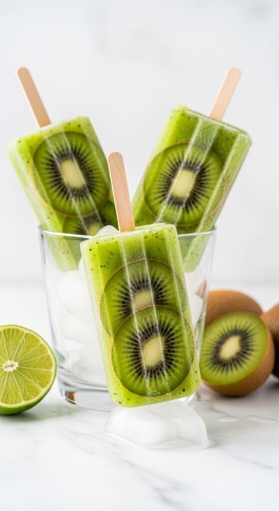 Kiwi lime popsicles have the most visually striking cross-section of any fruit popsicle — the black seed pattern of a kiwi slice frozen into the face of the popsicle looks like a stained glass window in miniature. Blend peeled kiwi with lime juice, honey, and a splash of water until smooth. Press thin kiwi cross-section slices flat against the inside face of the mold before filling — these freeze in place and are visible from the outside. Pour the kiwi purée over the slices to fill the mold. Kiwi fruits cost $0.30 to $0.60 each. A batch of eight popsicles costs about $3 total. These are the popsicle that children specifically pick because of how they look.