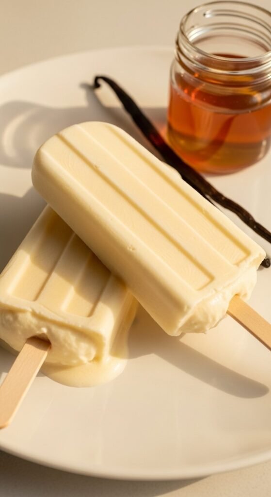 Honey vanilla creamsicle popsicles are the most classic and most comforting of the creamy popsicle options — a pure vanilla cream frozen into a dense, smooth pop that tastes like a cold vanilla ice cream bar. Mix heavy cream with honey, vanilla extract, and a pinch of salt until the honey is fully dissolved. Pour into molds and freeze for six hours. The cream base freezes slowly — overnight is the ideal freezing time for the creamiest possible texture. Real vanilla extract makes a noticeable difference over imitation — a small bottle costs $3 to $5 and lasts for many batches. A batch of eight popsicles costs about $4 total. These are the popsicle that adults reach for first.