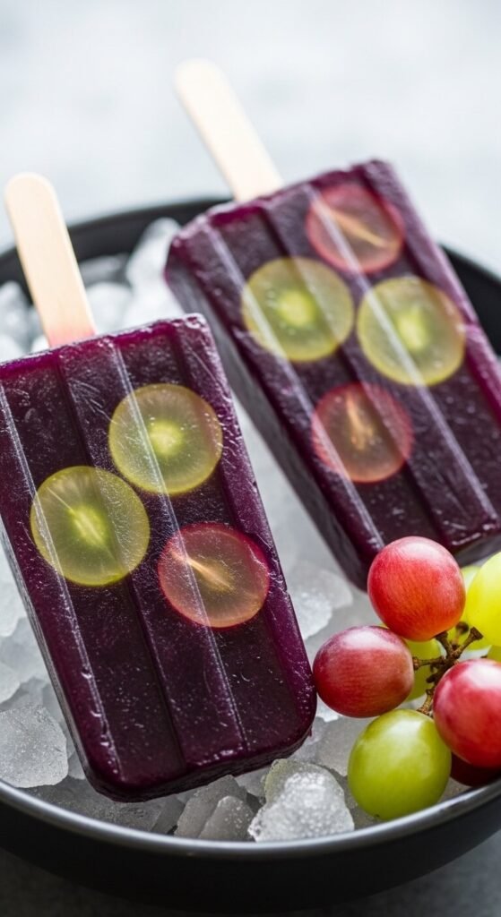 Grape juice popsicles require almost no preparation and produce one of the most vivid and jewel-like colors of any fruit popsicle — the deep purple is entirely natural and genuinely beautiful. Pour 100% grape juice directly into popsicle molds — no blending required. Drop halved grapes into the juice before inserting sticks — the grape pieces freeze suspended in the juice. A carton of 100% grape juice costs $2 to $3 and fills a full eight-popsicle mold with nothing left over to waste. A bunch of grapes costs $2 to $3 and provides more than enough halved pieces for decoration. Total batch cost: about $3. These are the simplest popsicle on the list and taste genuinely good.