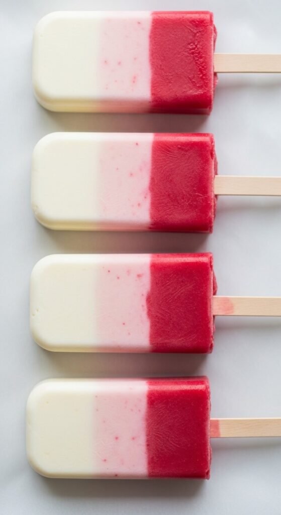 Two-layer popsicles look professionally made but are produced simply by freezing the first layer before adding the second — a technique that children can master easily and that produces a consistently beautiful result. Pour a blended strawberry layer into each mold and freeze for two hours until the strawberry layer is firm. Then pour a cream cheese or vanilla yogurt layer on top and freeze for a further four hours. The key is freezing the first layer long enough that it does not mix with the second when poured. If the first layer is not fully firm, the two colors bleed into each other and the visual distinction is lost. A batch of eight two-layer popsicles costs about $5.