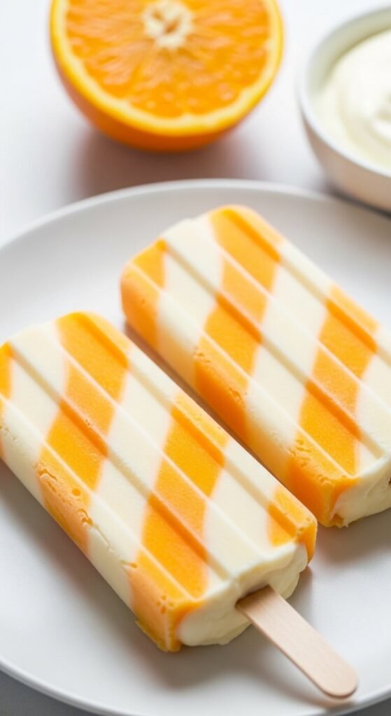 Orange creamsicle popsicles are the frozen recreation of the classic ice cream bar — orange juice on the outside, vanilla cream at the center — and they are one of the most nostalgically satisfying popsicle flavors for adults and children equally. Pour orange juice mixed with a little honey into the mold first, freeze for two hours, then fill the center of each partially frozen pop with a vanilla cream cheese mixture. The orange layer freezes around the cream center. Alternatively, swirl both layers together with a skewer for the pattern effect. Fresh orange juice costs $3 for a carton. A batch of eight orange creamsicle popsicles costs about $4 total.