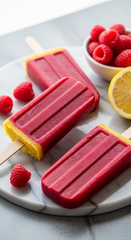 Raspberry and lemon together are one of the sharpest and most brightly flavored popsicle combinations — the tart lemon amplifies the already-sharp raspberry and creates a popsicle that makes the whole face wake up at first lick. Blend fresh or frozen raspberries with lemon juice, sugar, and water until smooth. Push through a sieve to remove the seeds — this step takes two minutes and produces a significantly smoother result than leaving the seeds in. Freeze in molds for four hours. Frozen raspberries cost $3 a bag and produce a purée just as good as fresh. A batch of eight popsicles costs about $4. The most tart popsicle on the list and genuinely loved for it.