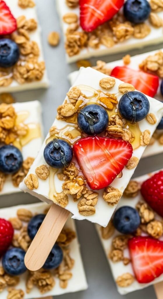 Frozen yogurt bark with inserted sticks is technically not a traditional popsicle — but it is the most flexible and most customizable frozen treat on this list, because every child can decorate their own section before it freezes. Spread a thick layer of sweetened Greek yogurt across a parchment-lined tray. Let every child scatter their own toppings — blueberries, sliced strawberries, granola, honey, and mini chocolate chips — across the surface. Press wooden popsicle sticks into the yogurt at regular intervals. Freeze for four hours then break along natural lines between the sticks. Each piece emerges as an individual handheld pop. A full tray serves eight children for about $6 total.