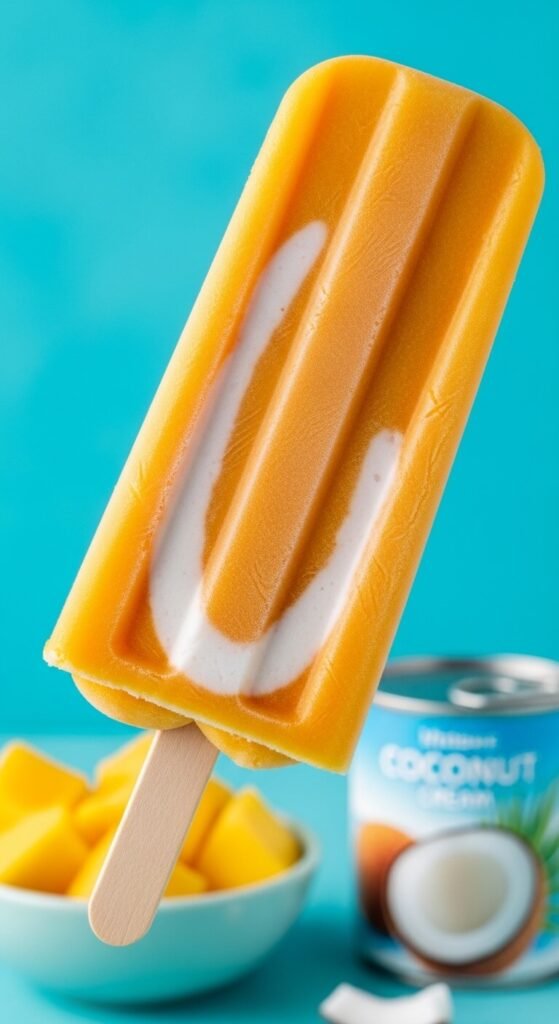 Mango and coconut together make one of the most naturally vivid and creamy popsicles possible — the deep orange of the mango against the white coconut cream creates a beautiful color contrast in the mold. Blend frozen mango chunks with a splash of coconut cream and a squeeze of lime juice until smooth. For a layered effect, pour mango purée into the mold first and freeze for one hour, then add a coconut cream layer and freeze again. Frozen mango from the freezer section costs $3 a bag. A can of coconut cream costs $2. A batch of eight popsicles costs about $4. The coconut cream makes these noticeably creamier than a pure fruit version.