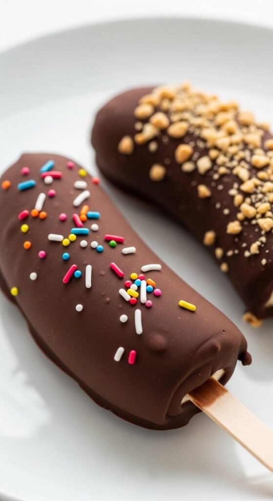 Chocolate banana popsicles are the simplest recipe on this list — a whole peeled banana on a stick, dipped in melted chocolate, and frozen. Peel bananas and insert a wooden popsicle stick into the flat end of each one. Freeze for two hours until solid. Dip each frozen banana quickly into melted dark chocolate — the chocolate sets almost instantly on contact with the frozen banana. Press sprinkles, crushed peanuts, or shredded coconut into the wet chocolate immediately before it fully sets. A bunch of bananas costs $1 to $2. A bag of chocolate chips costs $3. A batch of eight chocolate banana popsicles costs about $3 total. These are the easiest first popsicle recipe for young children.
