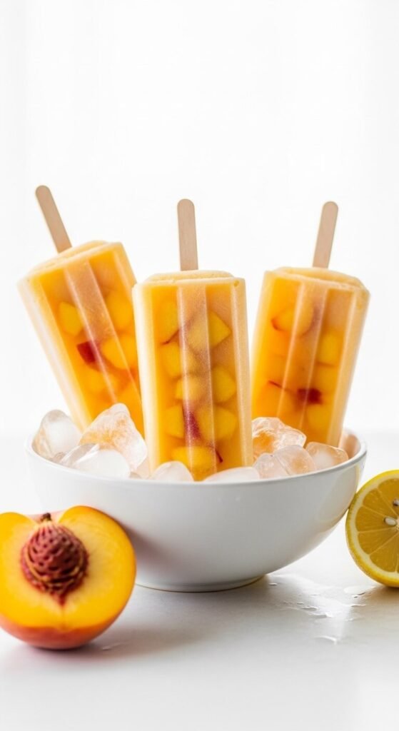 Peach lemonade popsicles taste like summer afternoon drinks frozen on a stick — the tartness of the lemonade and the sweet floral flavor of ripe peaches is the combination that makes these completely irresistible. Blend ripe peach slices with lemonade — store-bought is perfectly fine — until smooth. Pour into molds and drop one or two small peach pieces directly into each mold for visible fruit suspended in the popsicle. Freeze for four hours. Fresh peaches work best in summer, but canned peaches in juice (drained) work just as well at any other time of year and cost about $1.50 per can. A batch of eight popsicles costs about $4 total.