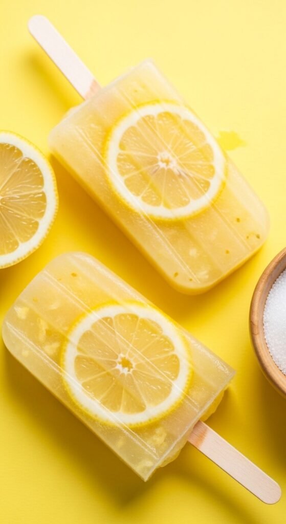 Frozen lemonade popsicles are the simplest and most universally loved summer popsicle — just lemon juice, sugar, water, and four hours in the freezer. Mix fresh lemon juice with simple syrup — equal parts sugar and water heated until dissolved and cooled — and pour into molds. For a dramatic visual effect, press a thin lemon wheel slice flat against the inside of the mold before filling — it freezes in place and is visible through the side of the popsicle. A bag of lemons costs $2 to $3 and makes multiple batches. A batch of eight popsicles costs about $2 total. Tart, sharp, and genuinely thirst-quenching on a hot day.
