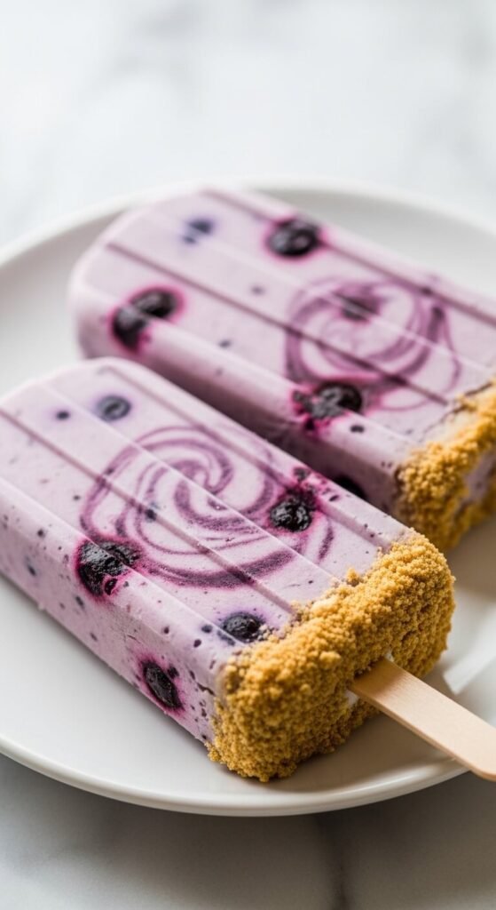 Blueberry cheesecake popsicles bring all the flavor of a no-bake cheesecake to a frozen handheld format — the graham cracker crumble pressed into the stick-end of the mold creates an edible crust at the base of every popsicle. Blend cream cheese, blueberries, honey, and vanilla until smooth. Press graham cracker crumble firmly into the base of each mold before pouring in the cream cheese mixture. The crumble sinks slightly into the filling and freezes in place. When unmolded, the graham cracker appears as a crust at the handle end. A batch of eight popsicles costs about $6. These taste like a frozen cheesecake slice on a stick.