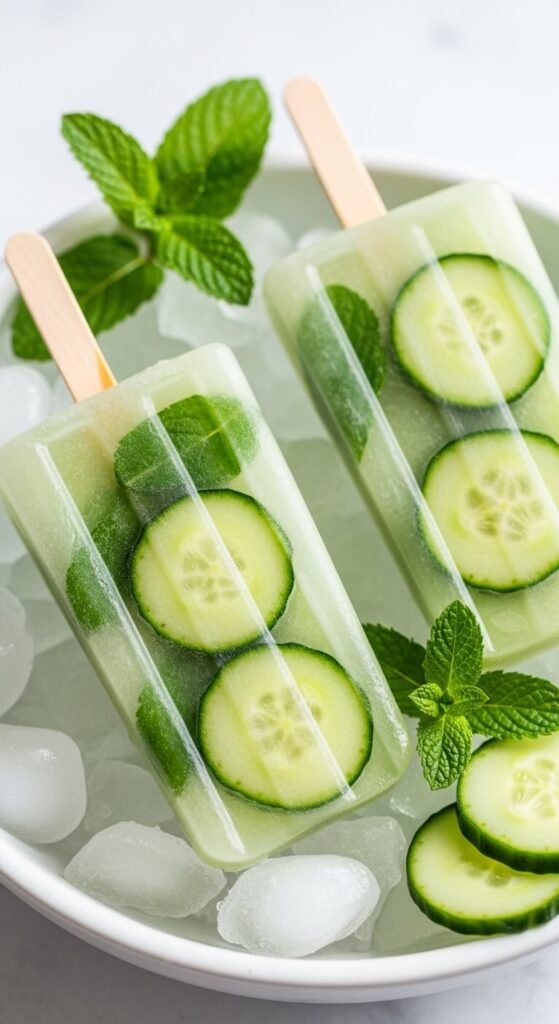 Cucumber mint popsicles are the most cooling and most genuinely thirst-quenching popsicle on this list — cucumber’s natural water content creates a lighter, less sweet frozen treat that feels more like a cold drink than a dessert. Blend peeled cucumber with mint leaves, lime juice, sugar, and water until smooth and strain through a sieve for a perfectly clear base. Pour into molds and drop thin cucumber slices and whole mint leaves directly into the liquid before freezing — they become visible decorative elements once frozen. A cucumber costs $0.50 to $1. A bunch of mint costs $1 to $2. A batch costs about $2 total.