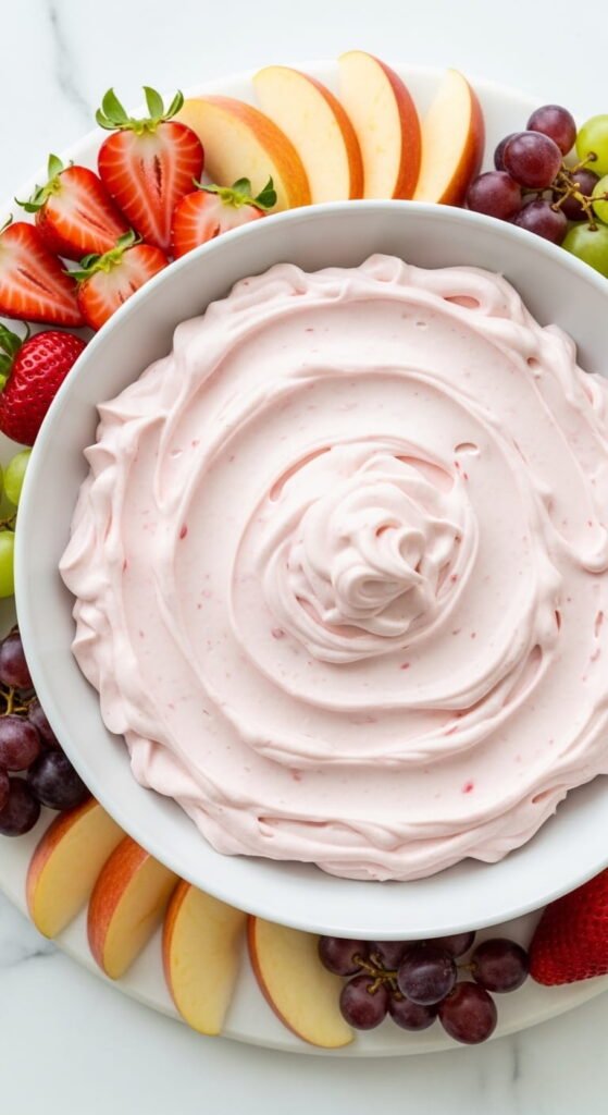 Beat 1 cup of heavy cream with an electric mixer until stiff peaks form. Gently fold in ½ cup of marshmallow fluff and 3 tablespoons of strawberry jam until just combined and pale pink throughout. Serve immediately as a dip with any fruit. Budget tip: Store-brand heavy cream and generic marshmallow fluff are readily available at any supermarket for minimal cost. Any flavor of jam works — use whatever you already have open in the fridge. This dip takes under three minutes to make and tastes genuinely indulgent. Store leftovers covered in the fridge for up to two days.