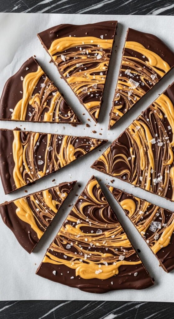 Melt 1 cup of dark chocolate chips and pour into a thin layer on a parchment-lined baking sheet. Warm ¼ cup of peanut butter briefly in the microwave until pourable. Spoon over the chocolate and drag a toothpick through both layers to create a swirl pattern. Sprinkle with flaky sea salt. Freeze for 10 minutes. Break into pieces. Budget tip: This recipe uses minimal ingredients and costs well under three dollars for a full tray. Store broken pieces in a zip-lock bag in the freezer — they keep for weeks and can be grabbed one piece at a time whenever a chocolate craving strikes.